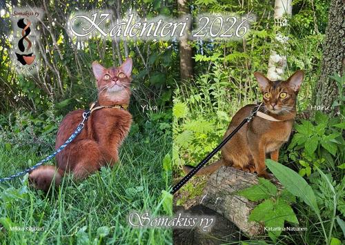 Somakiss ry on tehnyt abessinialais- ja somalikissojen kuvista jo perinteeksi muodostuneen kalenterin myös vuodelle 2026 - ja nyt tämä rakastettu kalenteri on viimein täällä! Kalenteri on suomenkielinen ja sisältää juhla- ja nimipäivät, koko avattuna A3.
